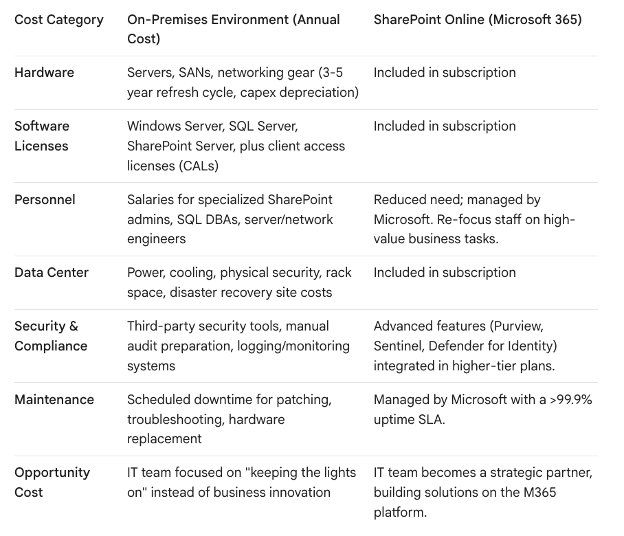When you honestly calculate the fully-loaded cost, the perpetual OPEX of an on-premises farm is almost always higher than a predictable Microsoft 365 subscription, which also includes a vast array of additional services.